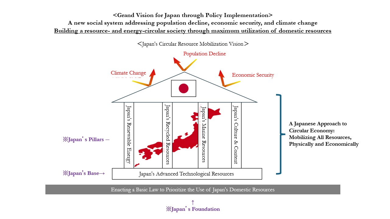 The proposal positions Japan’s urban mines, marine resources, renewable energy, and advanced technologies as abundant domestic resources, and calls for the building of a distinctly Japanese-style circular economy—one that circulates and utilizes all domestic resources—to address the challenges of population decline, economic security, and climate change. It presents a vision for transforming the Japanese archipelago into a self-sufficient domestic resource base by improving the self-sufficiency rate for resources and energy.