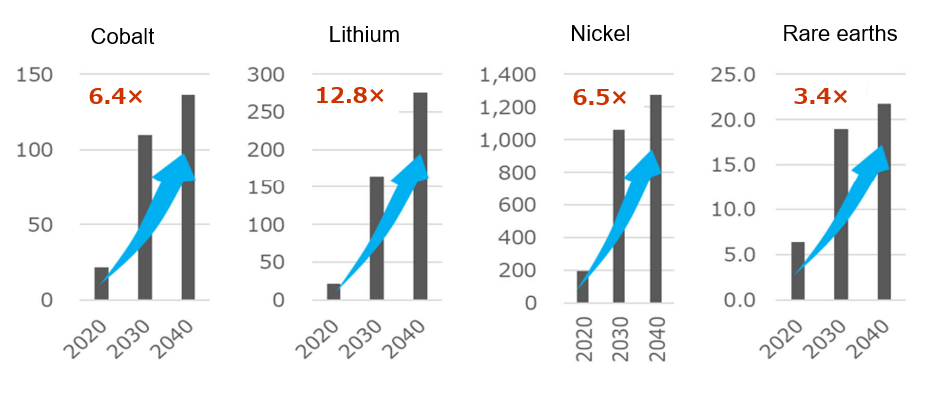 For example, power generation facilities for renewable energies such as wind and solar power require copper, aluminum, rare earths, indium, gallium, selenium and other resources. Meanwhile, lithium, cobalt, nickel, manganese, copper, and other elements are essential for the manufacture of the lithium-ion batteries that will play an important role in the shift to more efficient uses of energy. It is forecast that demand in 2040 for mineral resources used in such clean energy technology applications will increase significantly from 2020 levels, rising by 6.4× for cobalt, 12.8× for lithium, 6.5× for nickel, and 3.4× for rare earths (Fig. 1)[1].