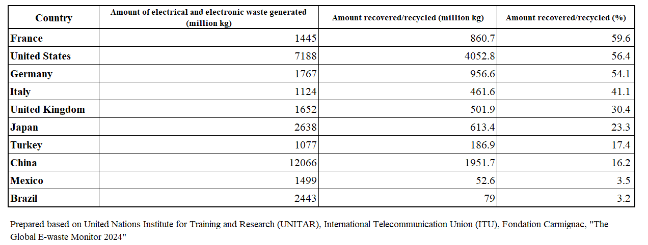 For example, the collection/recycling ratio for e-waste (waste consisting of electrical and electronic devices, e.g. discarded televisions and computers) in countries where the amount is at least 1,000 million kg was greater than 50% for the United States, France, Germany, and many other developed nations in 2022. Conversely, the ratio for Japan was significantly lower at just 23% (Fig. 3).