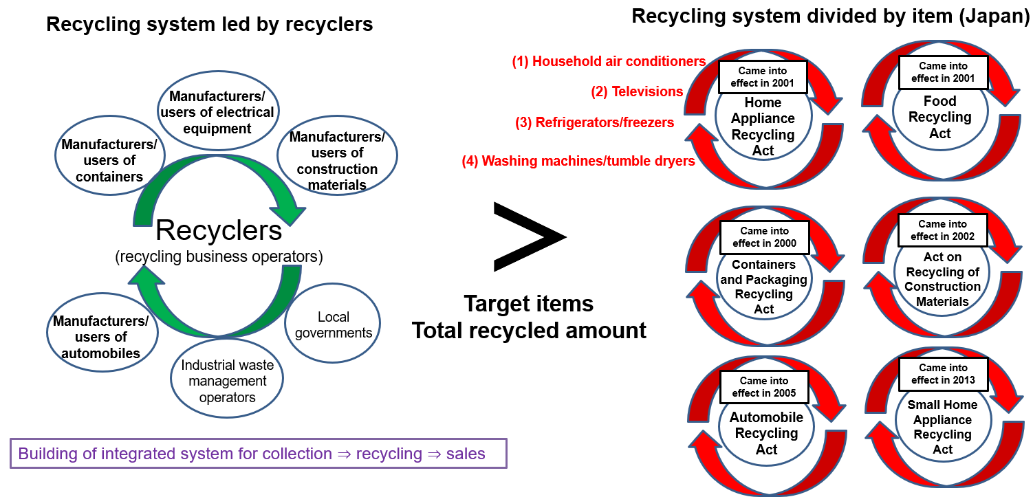 In terms of the legal system as it relates to resource recycling in Japan, the higher law is the Basic Act on Establishing a Sound Material-Cycle Society, which came into effect in 2001. This mentions the promotion of reduce, reuse, and recycle, and in that sense is roughly consistent with initiatives to promote circular economies worldwide (Fig. 4).