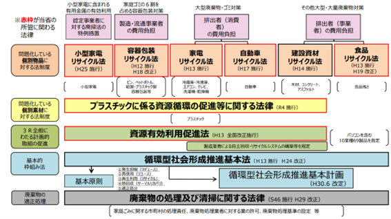 In 2022, the Act on Promotion of Resource Circulation for Plastics came into effect in response to the problem of buckets, hangers, and other plastics that did not fall under any of the various recycling laws being discarded without being recycled, an issue that the Act was intended to address by driving the collection and recycling of such items. This finally came into effect more than 20 years after the Basic Act on Establishing a Sound Material-Cycle Society, indicating that large quantities of plastic products had been discharged without being caught by the network of the legal system.